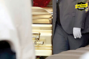 Con un ataúd de aparente acabado dorado y numerosos arreglos florales —entre ellos uno con
