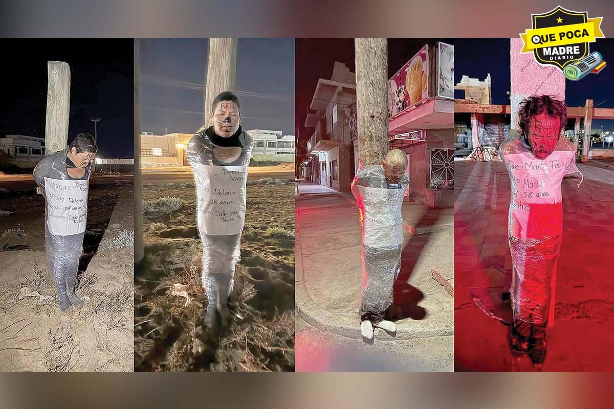 Se viralizaron las imágenes donde se muestra a varias personas atadas a postes de servicio y una más a una vieja construcción, con un cartel que dice “POR RATA” clavada en su cuerpo.