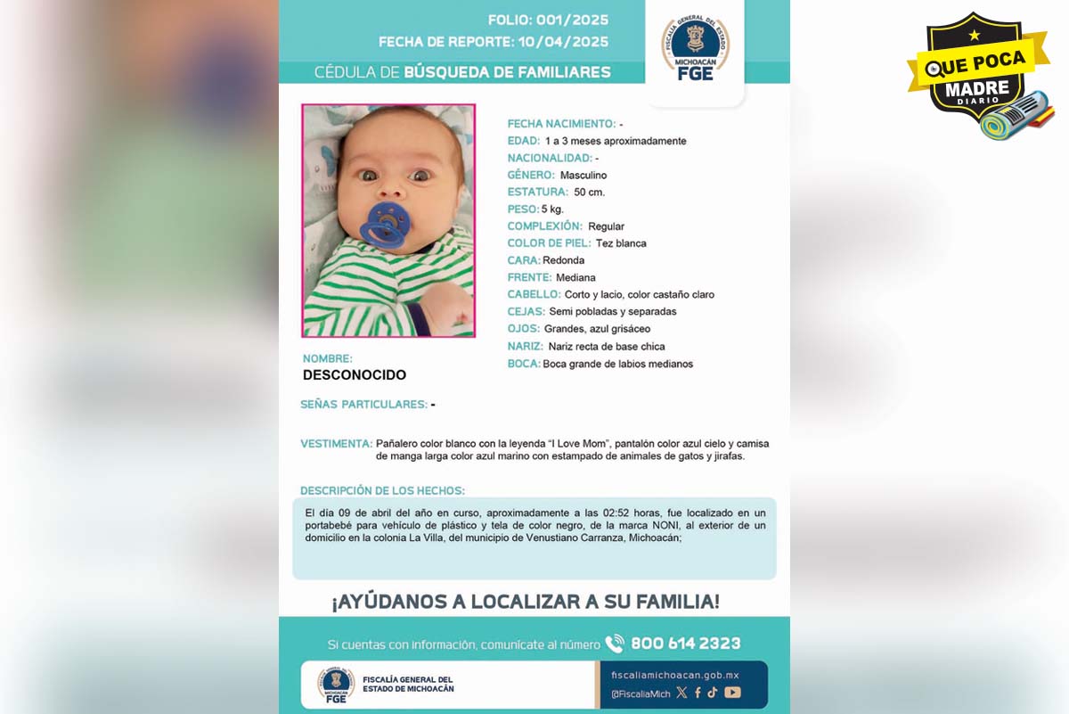 Un bebé fue encontrado solo fuera de un domicilio en la col. La Villa, en el municipio de Venustiano Carranza, el pasado 9 de abril, en Michoacán. El bebé fue trasladado a un albergue en Morelia.