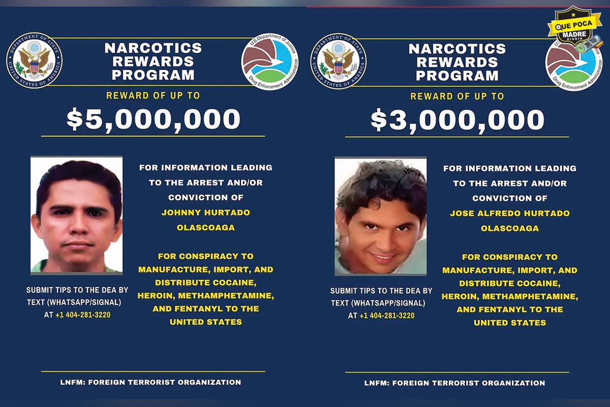 El Departamento de Estado también anunció recompensas de hasta 5 millones de dólares por Johnny Hurtado Olascoaga y otros 3 millones por su hermano José Alfredo, líderes del cártel.