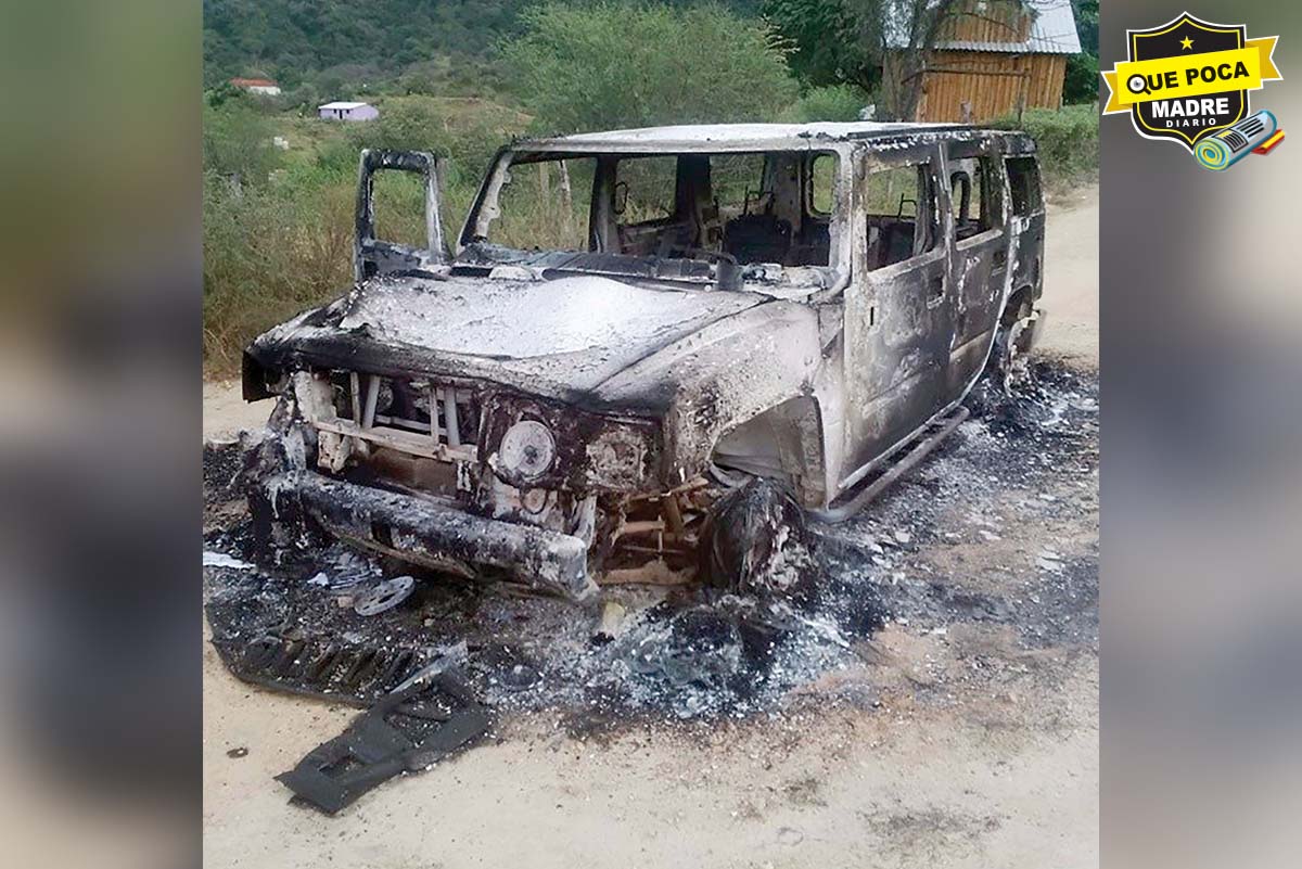 Mediante redes sociales se puede observar las imágenes de dos camionetas que quedaron completamente calcinadas, después de ser bombardeadas por artefactos explosivos lanzados desde drones.