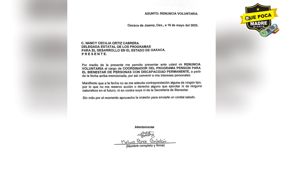 La causa de esta renuncia fue la difusión del video de la Coordinadora del Programa Pensión para el Bienestar de Personas con Discapacidad Permanente en Oaxaca, en la que se observa que se encuentra detenida y en estado de ebriedad en un operativo alcoholímetro.