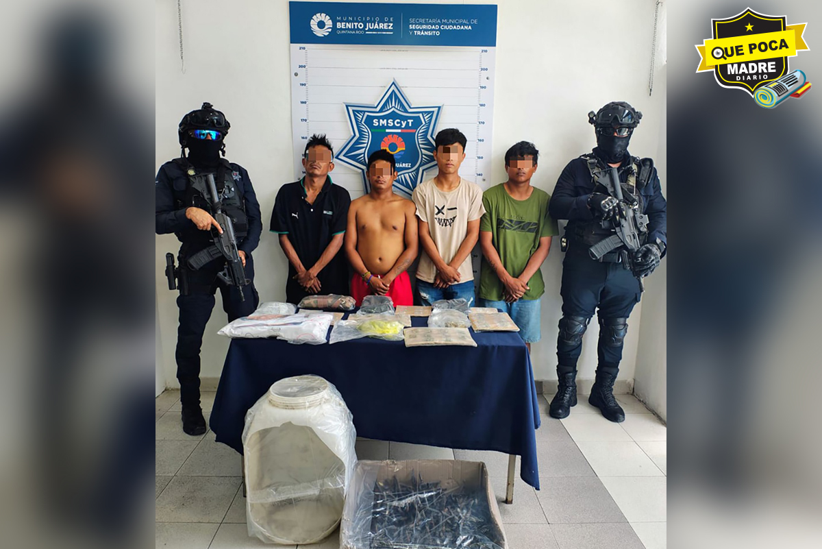 Elementos de la Secretaría Municipal de Seguridad Ciudadana y Tránsito de Benito Juárez detuvieron a cuatro personas en la Supermanzana 308, delegación Alfredo V. Bonfil, por su presunta participación en delitos contra la salud en la modalidad de narcomenudeo.