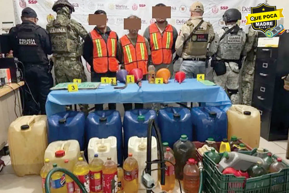 Dentro del inmueble, encontraron de todo: un letrero de presunta venta de gasolina, varios vehículos, embudos con mangueras, botellas con líquido, una cartulina con tabulador de precios (¡como si fuera tiendita!), polvo blanco granulado con características de “cristal”, un celular, y un montón de bidones, botellas y galones de diferentes capacidades llenos de lo que parecía ser ¡gasolina de dudosa procedencia! Y para rematar, una bomba acoplada a una manguera verde.