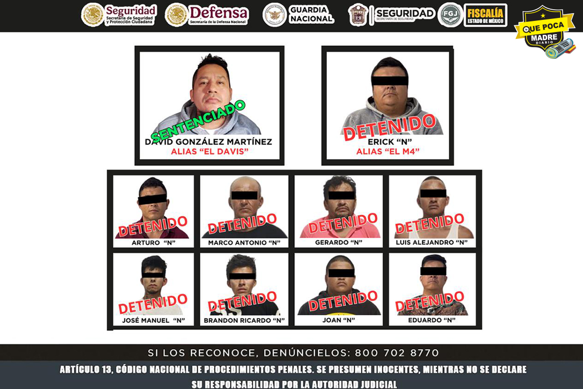Erick “N”, alias “M4”, Arturo “N”, Eduardo “N”, así como Marco Antonio “N”, Alejandro “N”, José Manuel “N”, Jhoan “N”, Brandon Ricardo “N” y Gerardo “N”, fueron ingresados al Centro Penitenciario y de Reinserción Social de Tlalnepantla, quedaron a disposición de un Juez quien determinará su situación jurídica. Marco Antonio “N”, Alejandro “N”, José Manuel “N”, Jhoan “N”, Brandon Ricardo “N” y Gerardo “N”, están vinculados a proceso por dos hechos diversos de extorsión.