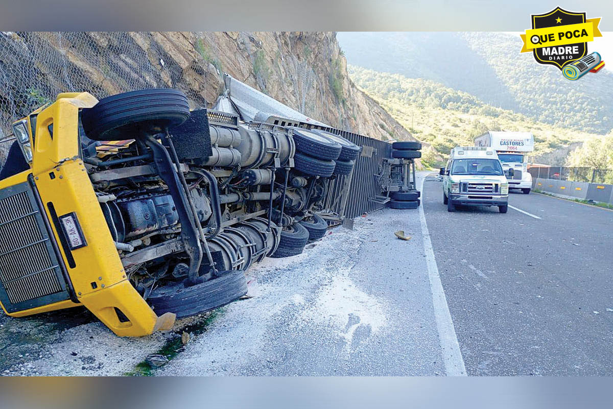 Un joven de 19 años que conducía un camión de carga perdió el control del volante al intentar rebasar otro vehículo, lo que provocó que se impactara contra un talud y volcara sobre el kilómetro 231 del tramo Los Chorros de la carretera 57, en Arteaga, Coahuila.