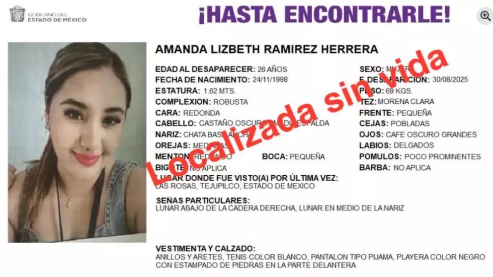 Amanda Lizbeth, una maestra de 26 años que había sido reportada como desaparecida desde el pasado sábado, fue localizada sin vida en un terreno de cultivo del barrio Las Mesitas, en Tejupilco, Estado de México. El hallazgo se dio la noche del viernes, cuando policías recibieron un reporte sobre un cuerpo en estado de descomposición.
