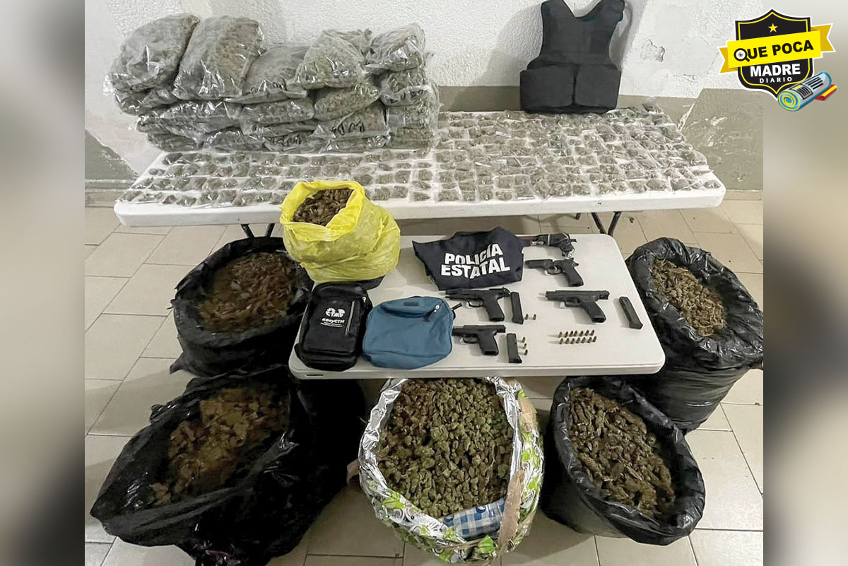 También aseguraron una camisola con la leyenda “Policía Estatal”, dos mariconeras, una mochila, un chaleco balístico, cinco pistolas, tres de ellas caseras, dos más calibre nueve milímetros, un par de cargadores, diversos cartuchos útiles y dos motocicletas con reporte de robo vigente.