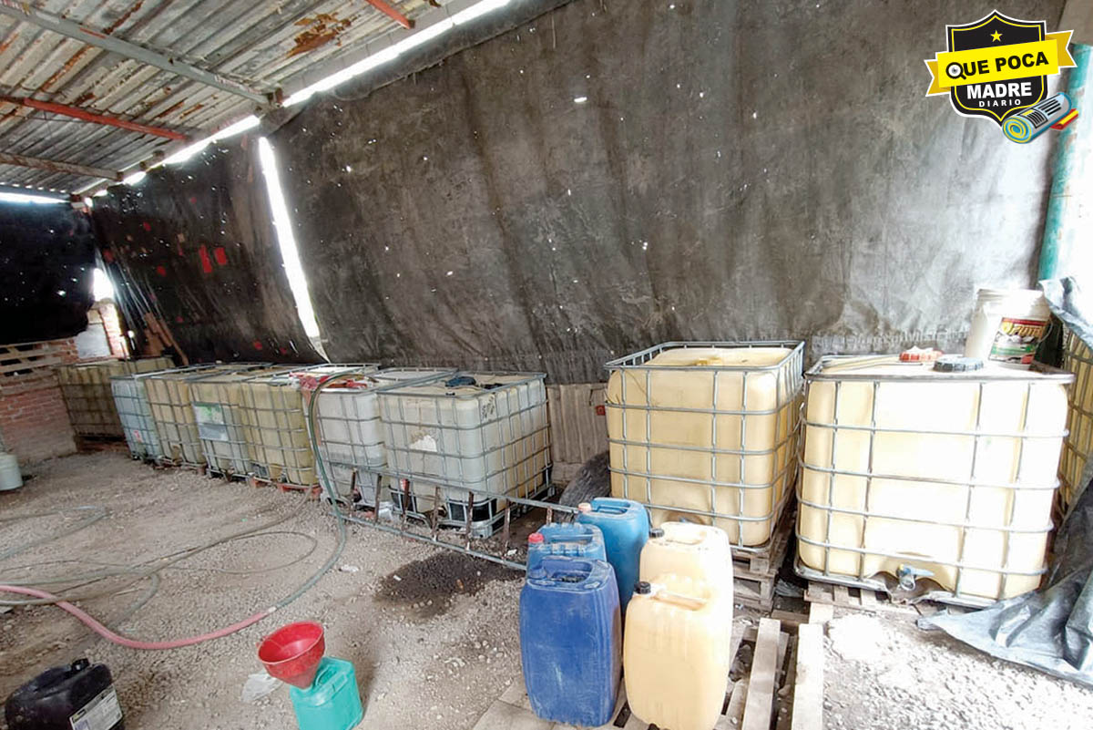 Elementos policiales se trasladaron al sitio delimitado con tarimas, un zaguán metálico color negro, donde localizaron bidones de mil litros de capacidad que contenían el hidrocarburo, además inspeccionaron un vehículo marca International, color blanco con rojo, modificado que en su área de carga tenía una cisterna metálica de fabricación artesanal de la cual salía gasolina.