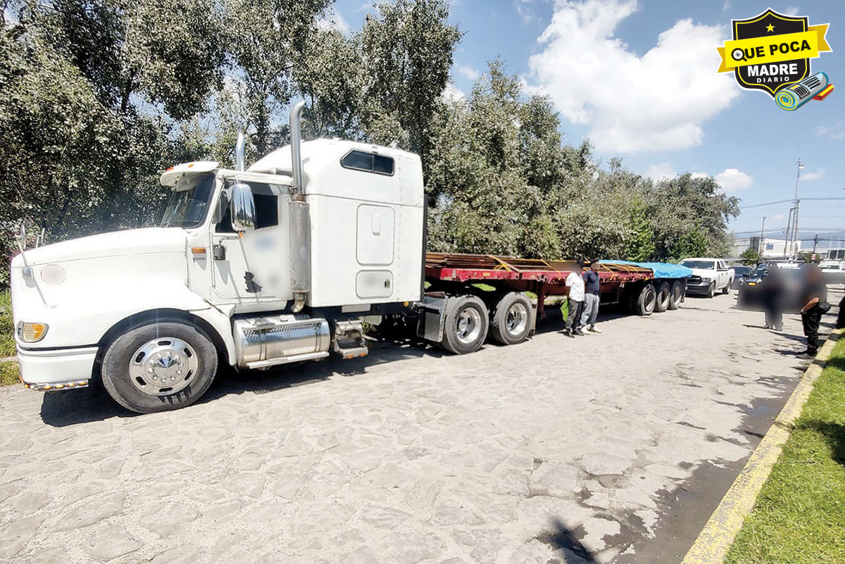 Al llegar los efectivos estatales al lugar se ubicó a dos sujetos, uno de ellos que conducía un tractocamión marca Internacional color blanco, acoplado a una plataforma con placas de acero; el segundo viajaba en una camioneta Jeep Cherokee color blanco, a quienes les dieron alcance.