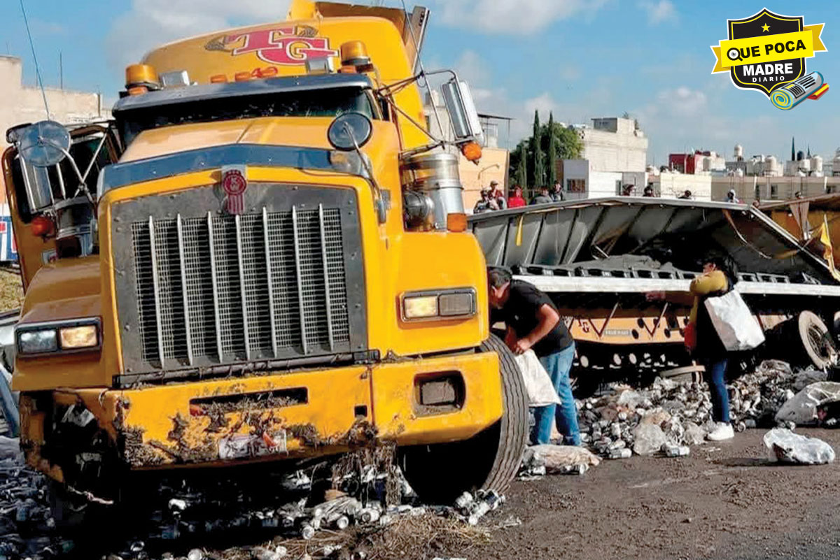 Un tráiler doble remolque que transportaba 60 toneladas de cerveza volcó la mañana de este jueves sobre la autopista México-Pirámides, a la altura del km 3 en Ecatepec, alrededor de las 5:30 a.m. El accidente generó caos vial y permitió que decenas de personas sustrajeran cajas de cerveza aprovechando el desorden.