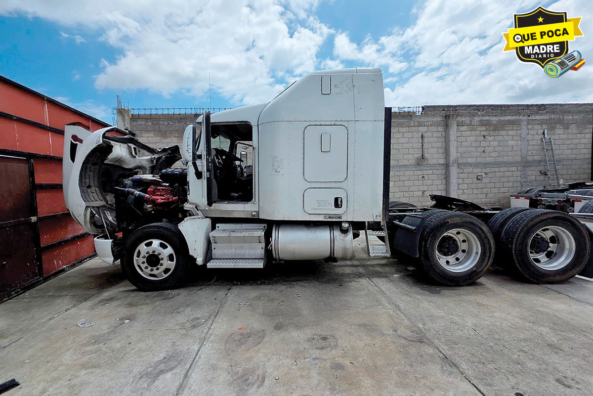 Durante este despliegue, también fue localizado, frente al inmueble, otro tractocamión sin placas de circulación y con sus medios de identificación modificados.