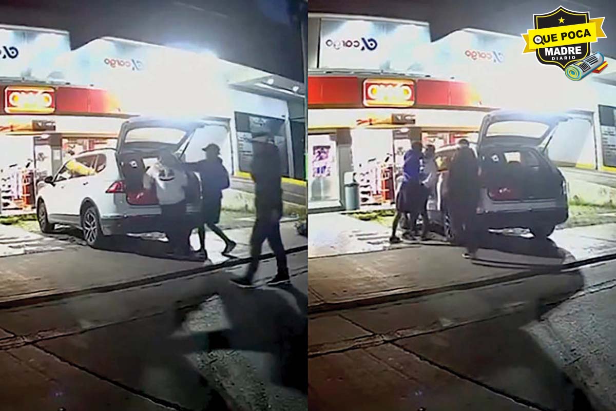 Mediante las imágenes de cámaras de seguridad se captó a dos sujetos armados que interceptaron a un hombre afuera de un Oxxo, en la colonia Hacienda del Parque.