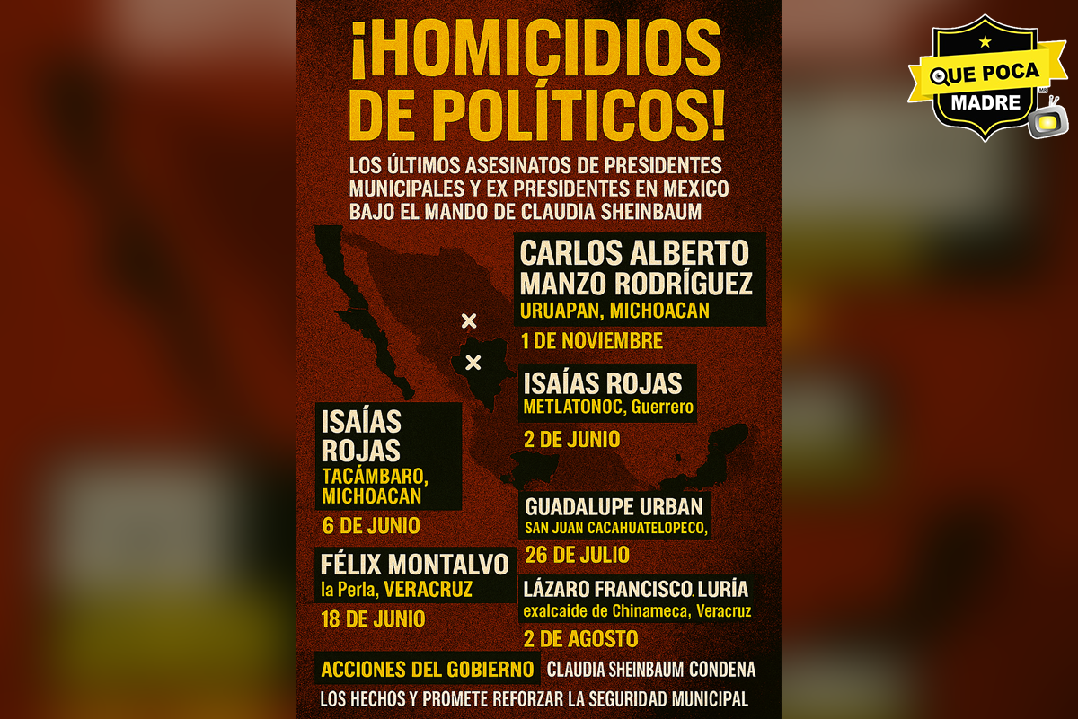-Carlos Alberto Manzo Rodríguez, alcalde de Uruapan, Michoacán, fue asesinado el 1 de noviembre durante el Festival de las Velas. Su muerte generó reacciones internacionales y protestas ciudadanas.