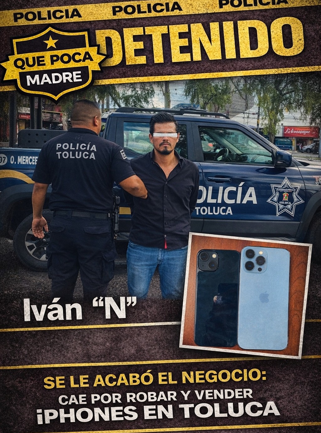 De acuerdo con el reporte, el sujeto, identificado como Iván “N”, de 43 años, ofrecía en línea dos iPhone robados, lo que permitió a las autoridades ubicarlo en la Gran Plaza Toluca, donde fue interceptado.
